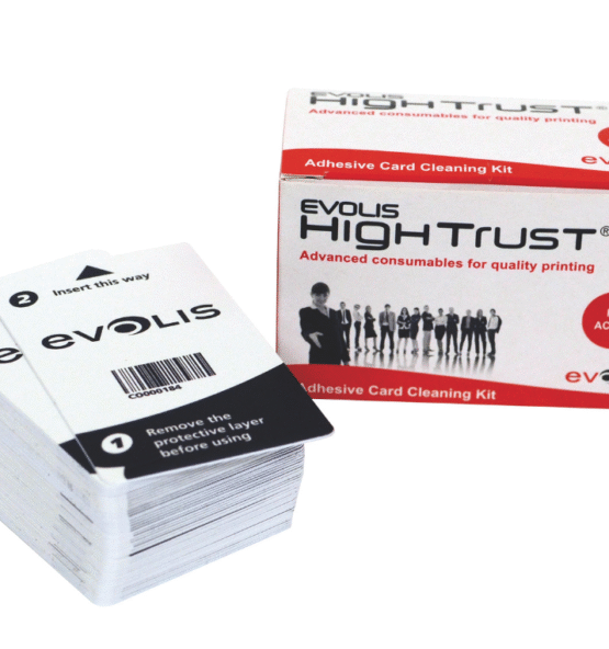 La caja del kit de limpieza adhesivo de Evolis contiene tarjetas de limpieza con una superficie pegajosa, protegida por una película despegable. Estas tarjetas están diseñadas para limpiar los rodillos de transporte de la impresora. Al pasar a través del mecanismo, su superficie adhesiva recoge el polvo, la grasa y otras partículas de los rodillos, previniendo atascos y asegurando que las tarjetas de PVC se deslicen de manera uniforme y sin contaminantes durante la impresión. Su uso regular es clave para un mantenimiento preventivo y para evitar manchas en las credenciales.